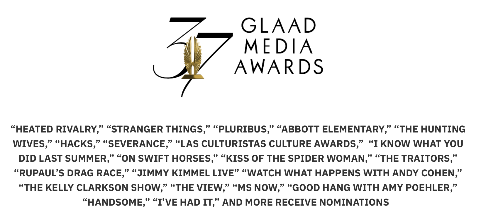 Congratulations to all 291 nominees! Winners will be announced at the GLAAD Media Awards ceremony on March 5 in Los Angeles, venue to be announced.