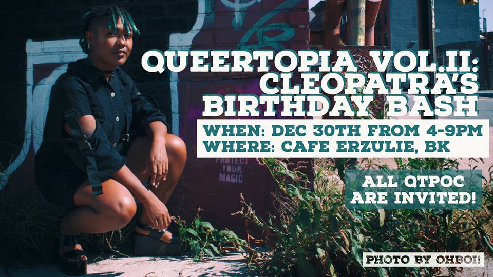 4 PM – 9 PM, free, 894 Broadway, Brooklyn. All QTPOC are invited to come drink and dance with the Brooklyn LGBTQ family. Dance to the sounds of Neon Nuckles, and pose for a photo by Nerdscarf. Open birthday celebration for Cleopatra. Get ready to be lit AF and queer/twospirit/POC/lgbtqiagnc AF. Suggested Dresscode: Wear your flashiest outfit in honor of pre-NYE! Glitter is highly encouraged.