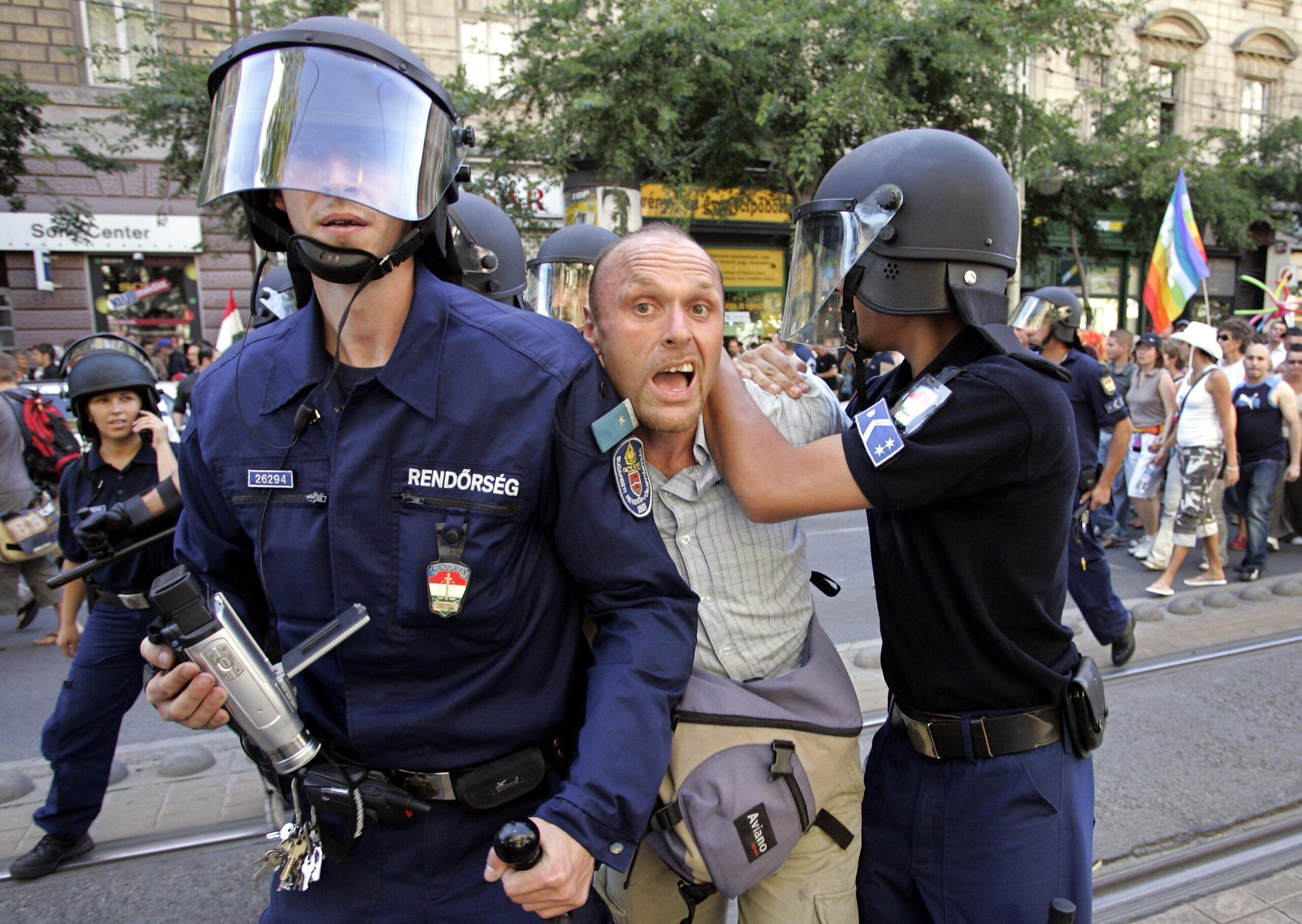 More than 200 members of the two groups, Movement for a Better Hungary and the neo-Nazi Hungarian National Front, threw eggs, smoke bombs and bottles as parade floats traveled from Heroes’ Square to a dance club near a bridge crossing the Danube. Some injuries and hospitalizations were reported.
