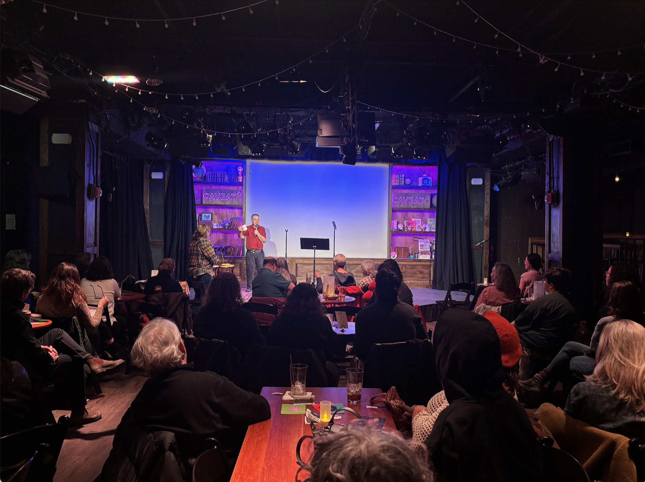 Everyone’s favorite nonbinary ex-nun turned nurse brought her game – and her sister – to a full house at Caveat on Feb 21 for an interactive exploration of truth and fiction. “We Were Such a Happy Family: Adventures in Fact, Fiction, and the Nebulous Nature of Memory” is a two-person show and workshop, conceived by Kelli Dunham and Beth Dunham Toner. It draws on quirky family recollections and conversation to ask: