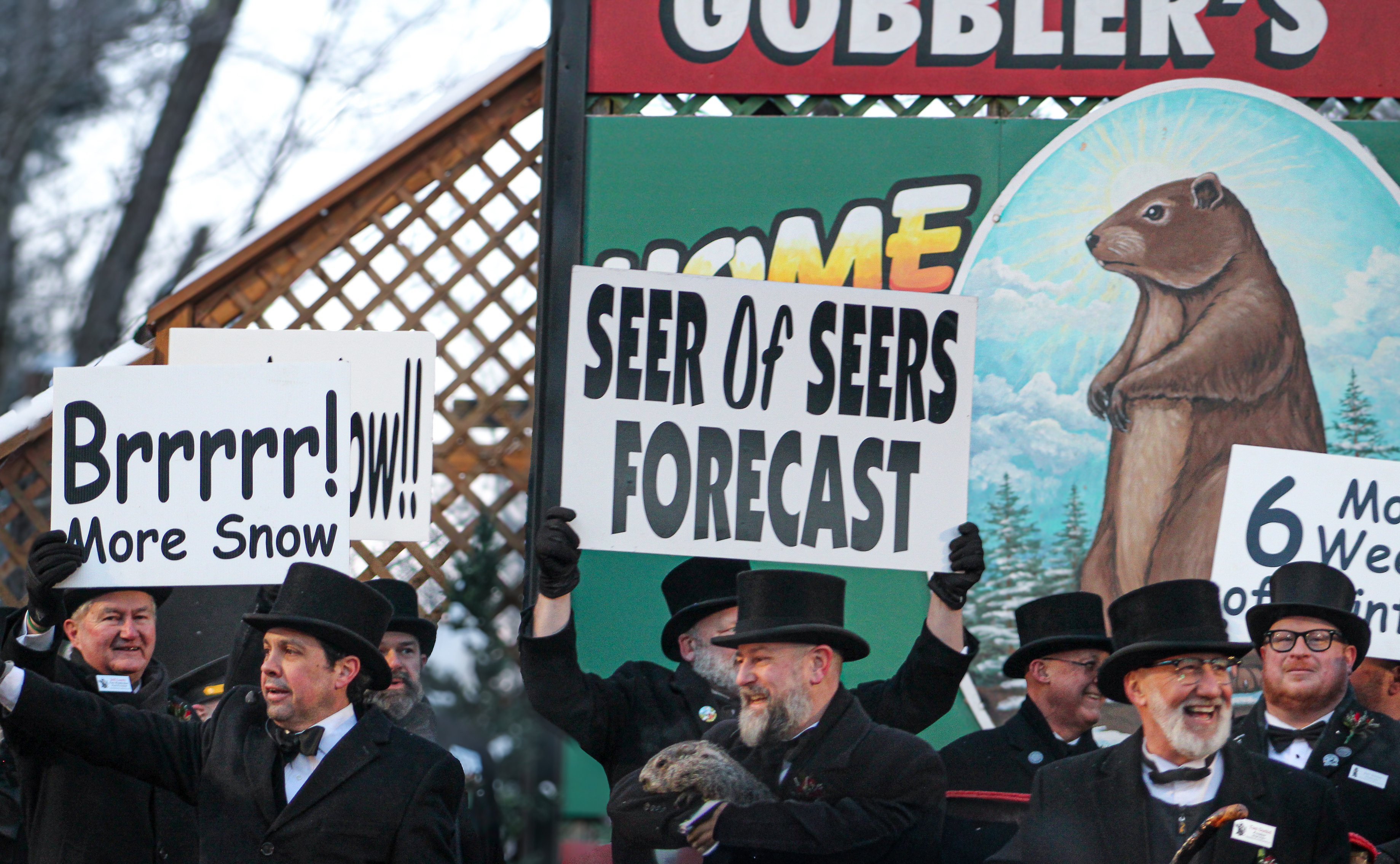 Miss Pennsylvania stood next to the men in her tiara and sash as a member of the Inner Circle led the crowd in a guttural call and response consisting solely of the word “groundhog.” Phil’s interpreter was leading the show. As he explained to the crowd, he is able to translate Phil’s language through his magic cane, which was handed down to him by his father. It was this cane that he raised in the air as Phil’s handler brought him out. People went crazy. You’d think Taylor Swift herself had come out of that stump. The prognosticator looked slightly bothered by the ordeal but nevertheless ready to make his legendary prediction. There are two scrolls that are written by Phil. The interpreter reads out the one Phil selects, which is based on whether or not he sees his shadow. The Old English, combined with pomp and circumstance, makes it feel like we were finding out who the next King would be. After the preamble, the interpreter got to the meat of the scroll. His voice got louder as he revealed that six more weeks of winter had been foretold. Widespread groans spread through the crowd but were quickly overrun by cheers. People didn’t like the response, but were still very happy to be there.