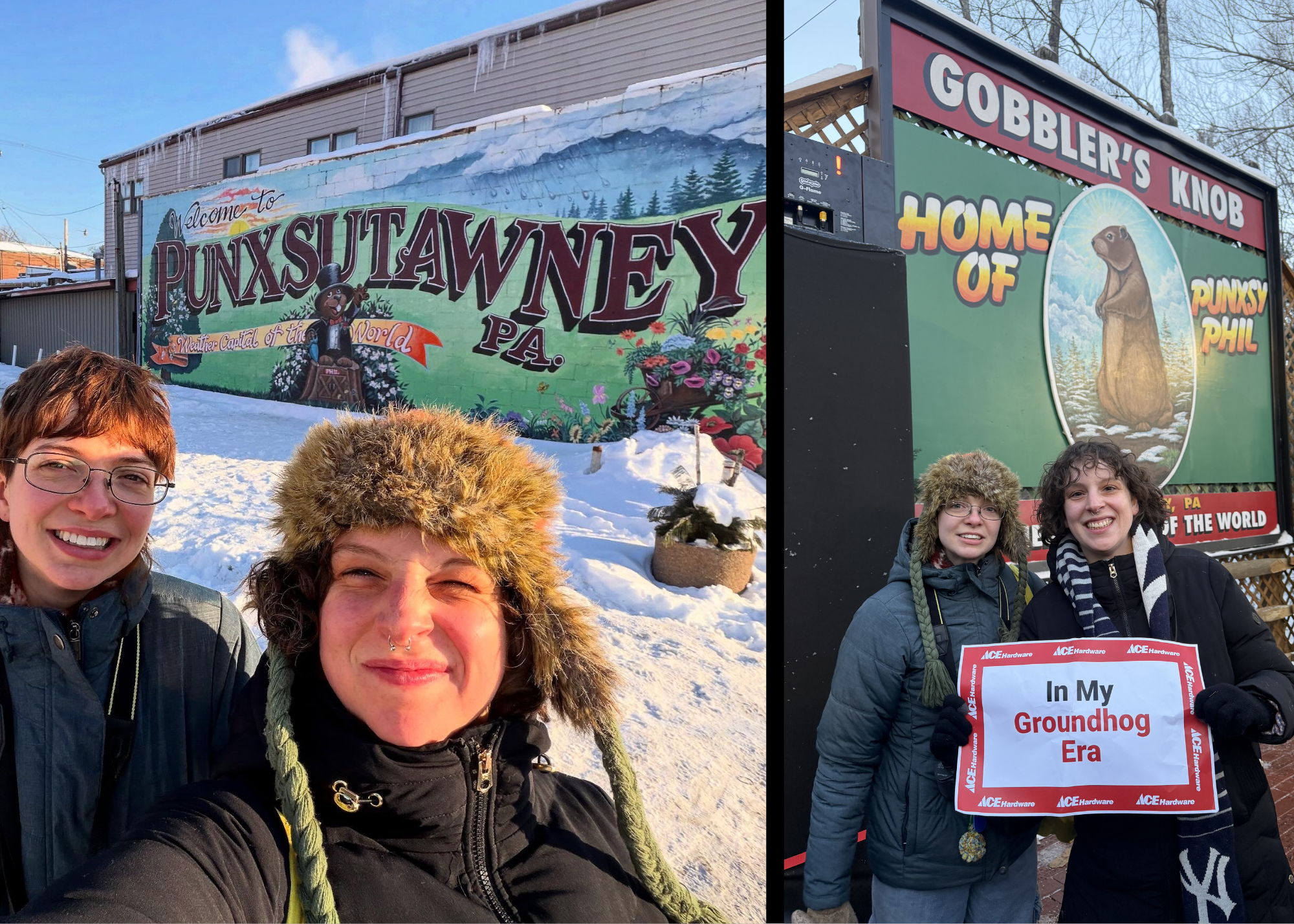 Ruth and I were both surprised at the lack of “characters.” Sure, there was the one guy with a wig, an all-blue futuristic outfit, and a light-up scepter, but he was the exception. The main accessory was fuzzy groundhog hats; they reminded me of the animal hat trend from the 2010s- but with more fur. We also talked to Tut, a Punxsutawney local and Groundhog Day sceptic. She said most of the residents leave town for the weekend to avoid all the chaos. But any attitude she had against the holiday was overturned by her jeans. They were covered in people’s signatures and decorations, including a log of all of Phil’s predictions over the last few years.