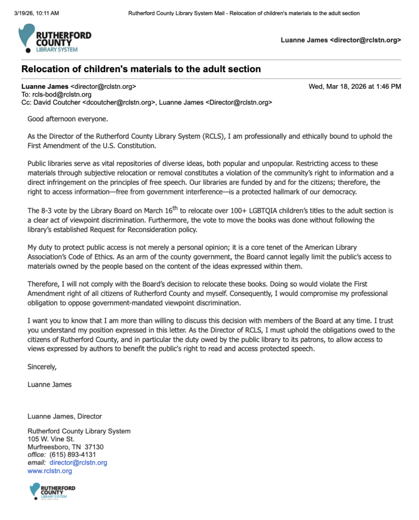 On Monday, March 16, amid a packed audience, the Rutherford County Library System Board voted to relocate more than 190 books from children and teen sections to adult shelves. Two days later, the library director responded with a letter—and her absolute refusal to follow the order. Citing the U.S. Constitution, Luanne James, Director of the Rutherford County Library System (RCLS), wrote: “Restricting access to these materials through subjective relocation or removal constitutes a violation of the community’s right to information and a direct infringement on the principles of free speech.”