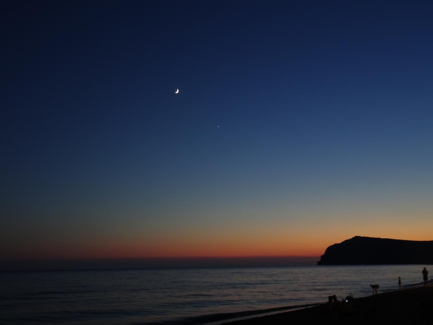 Skala Eressos – Night: View of the beach with the moon and Venus visiblePhoto by Olivia Typaldos