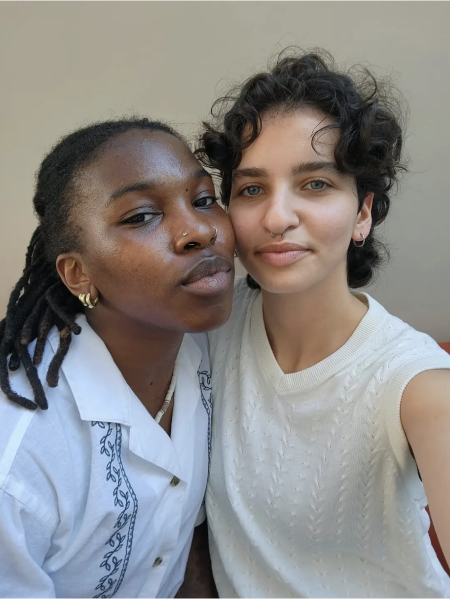 Rose (she/they) and Jay’s (they/them) story begins in peak queer fashion: two people “just looking for friends” on Bumble, swiping through the Houston area with zero expectations. Rose was visiting from Chicago and hoping to meet people beyond her family. But the friend-search quickly slipped into the classic gay friends-to-lovers pipeline. And Jay—who’s originally from Nigeria—was one of her very first matches.
