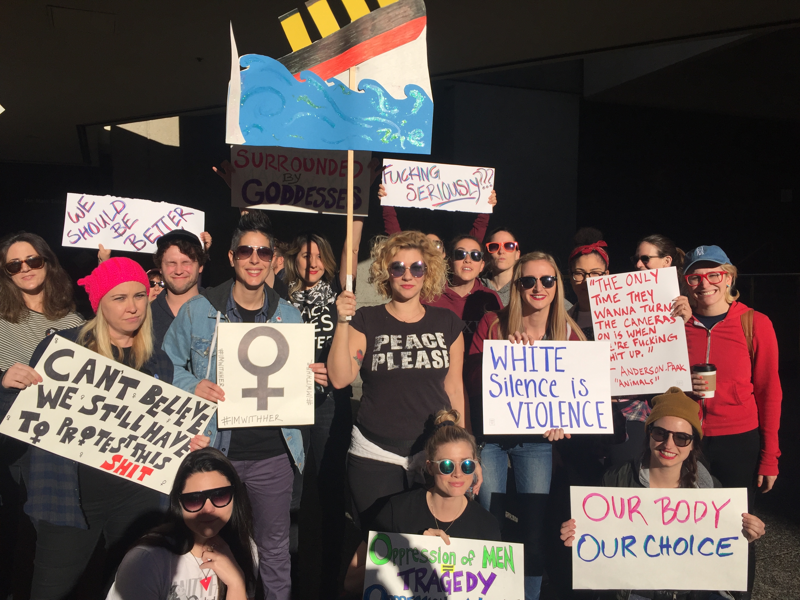 I went to the March with 14 friends—one had a sinking Titanic for a sign reading “Women and children and LGBTQs and immigrants first.” She held it up high so we could follow her through the crowd. It was so dense, thick with marchers who couldn’t go anywhere because there were so many of us. I was surrounded by young children, teen girls, an elderly butch couple, radical anarchists, trans women—even women who might not consider themselves feminists but are ultimately a part of the rallying cry. We were all there, and that was something I can truly say I’ve never felt more optimistic about.”