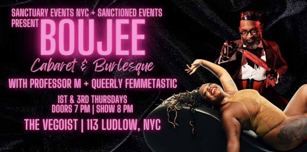 BOUJEE CABARET & BURLESQUE is a collaboration with Sanctuary Events NYC + Sanctioned Events, known for providing inclusive, quality kink events and locations centered on BIPOC and LGBTQ+ kinksters and welcome to all. This night of decadent, scandalous cabaret and burlesque entertainment keeps it fancy and funky with a BDSM and kink-inspired live revue.
