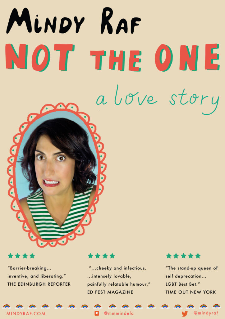 With an open mind, heart, and vagina Mindy Raf demolishes the romantic comedy and the roles we play in it in her critically acclaimed solo show NOT THE ONE: a love story. Honing the perfect blend of her stand-up, storytelling, and musical theater chops, Raf demystifies love, loss, and sexuality, and engages her vulnerable, razor-sharp storytelling style to face the complexities of modern love and leave us asking, “could I ever do that?”