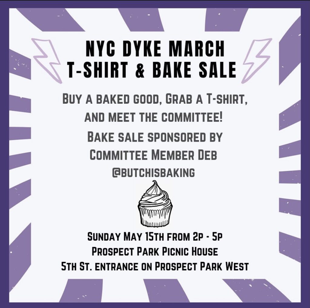 Eating cookies with Dykes in the sunshine? Sign me up! THIS SUNDAY, May 15th from 2p – 5p, come support the NYC Dyke March at our T-Shirt and Bake Sale! Look for us by the picnic house (enter at 5th or 9th street—both are wheelchair accessible). Sponsored by Committee Member Deb @butchisbaking , it’ll be a tasty time for sure.