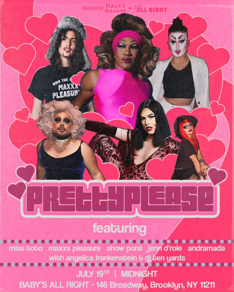 This drag show requires good manners! Pretty Please is presented by rockstar drag king Maxxx Pleasure and Baby’s All Right, and features drag performers that will have you asking for more! Come on Friday July 19 to see Miss Toto (Miami’s premiere gender-bending body-building drag queen), Maxxx Pleasure, Jenn d’Role, Show Ponii, and Andramada, with Angelica Frankenstein as your host and DJ TenYards on tunes! Doors @ 11, Shows @ 12, 1, 2. Tickets are $5 in advance, $10 day of show. This event is 21+. Please see the link for directions, accessibility info and Baby’s Safer Space policy.