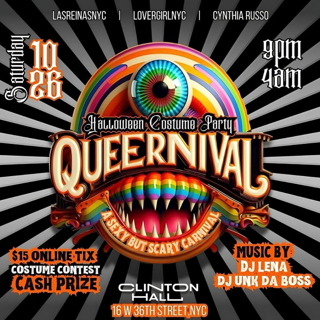 Join CYNTHIA RUSSO, LASREINASNYC & LOVERGIRL NYC @ our Annual SEXY, SCARY HALLOWEEN EVENT……QUEERNIVAL COSTUME PARTY