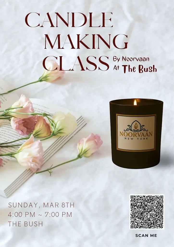 Guided by the Noorvaan team, you’ll create your own custom candle using our clean coconut–soy–beeswax blend and choose from a curated selection of signature scents inspired by South Asian botanicals, cozy evenings, and NYC energy. No prior experience needed, just come as you are.