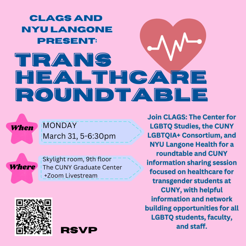 Join CLAGS: The Center for LGBTQ Studies, the CUNY LGBTQIA+ Consortium, and NYU Langone Health for a roundtable and CUNY information sharing session focused on healthcare for transgender students at CUNY, with helpful information and network building opportunities for all LGBTQ students, faculty, and staff.