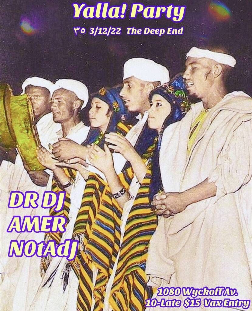 Yalla! Party Project is an Arts collective centering Queer SWANA & BIPOC Women and friends. Their emblematic Brooklyn dance party features international and local DJs spinning a variety of North African sounds, Arabic pop, and global grooves, celebrating the healing power of safe spaces and the communities behind them.