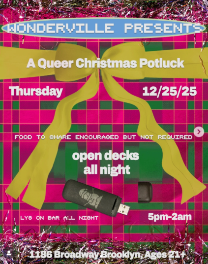 Dec 25 5:00 pm Wonderville Presents A Queer Christmas Potluck Wonderville 1186 Broadway, Brooklyn Event Details Get Directions
