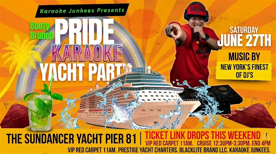 Jun 27 Karaoke Junkees Presents: Boozy PRIDE Brunch!! Beach Day Vibes! 11:00 am - 4:00 pm Pier 81 West 41st Street, New York Event Details Get Directions