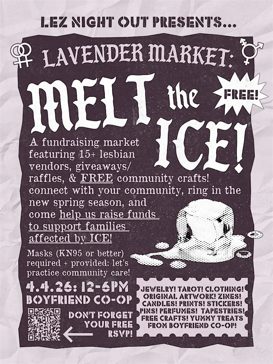 Boyfriend Co-op 1157 Myrtle Avenue, Brooklyn, NY, United StatesA spring lesbian market featuring 16+ vendors & FREE community crafts + resources, where we’ll be fundraising for families affected by ICE! Lavender Market is a recurring art + free resources market hosted and organized by lesbian event group Lez Night Out! Join us April 4th for our Lavender Market of the spring season! Featuring 16+ vendors, cute community […]