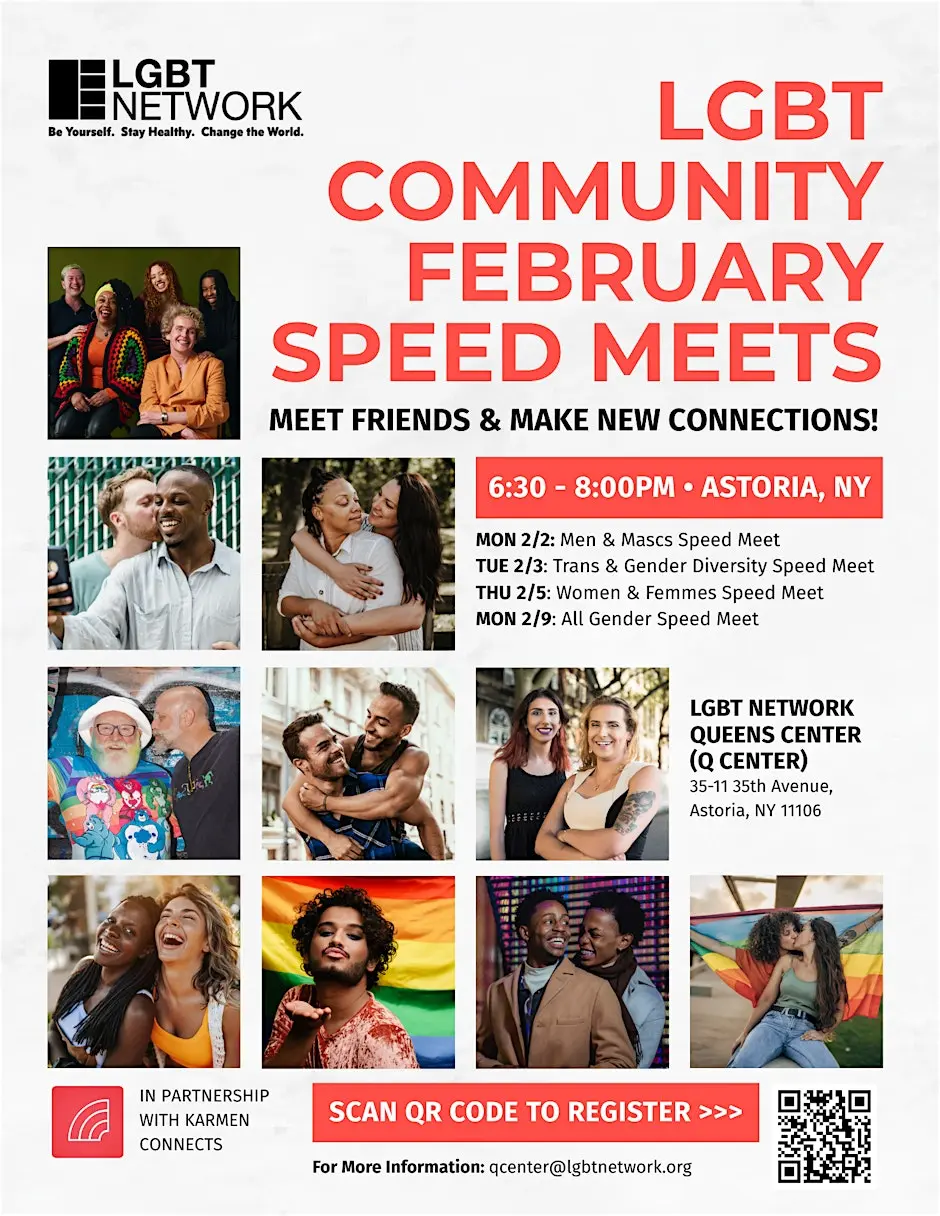 Feb 5 Women & Femmes Community Mixer: Speed-Meet! 6:30 pm - 8:00 pm Q-Center 35-11 35th Avenue, Queens Event Details Get Directions