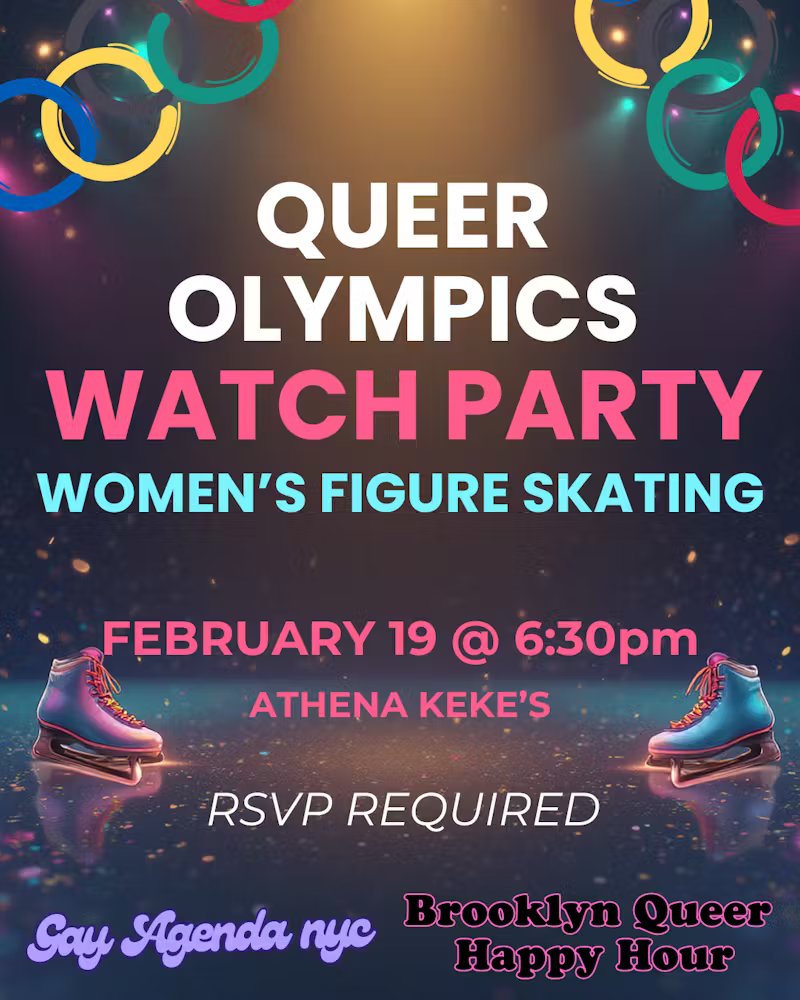 Feb 19 Queer Olympics Figure Skating Watch Party 6:30 pm Athena Keke's 222 Greene Ave, Brooklyn Event Details Get Directions