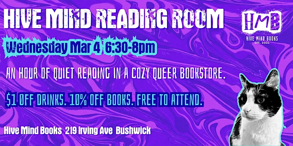 Mar 4 Hive Mind Reading Room: Silent Reading Night 6:30 pm - 8:00 pm Hive Mind Books 219 Irving Avenue, Brooklyn Event Details Get Directions
