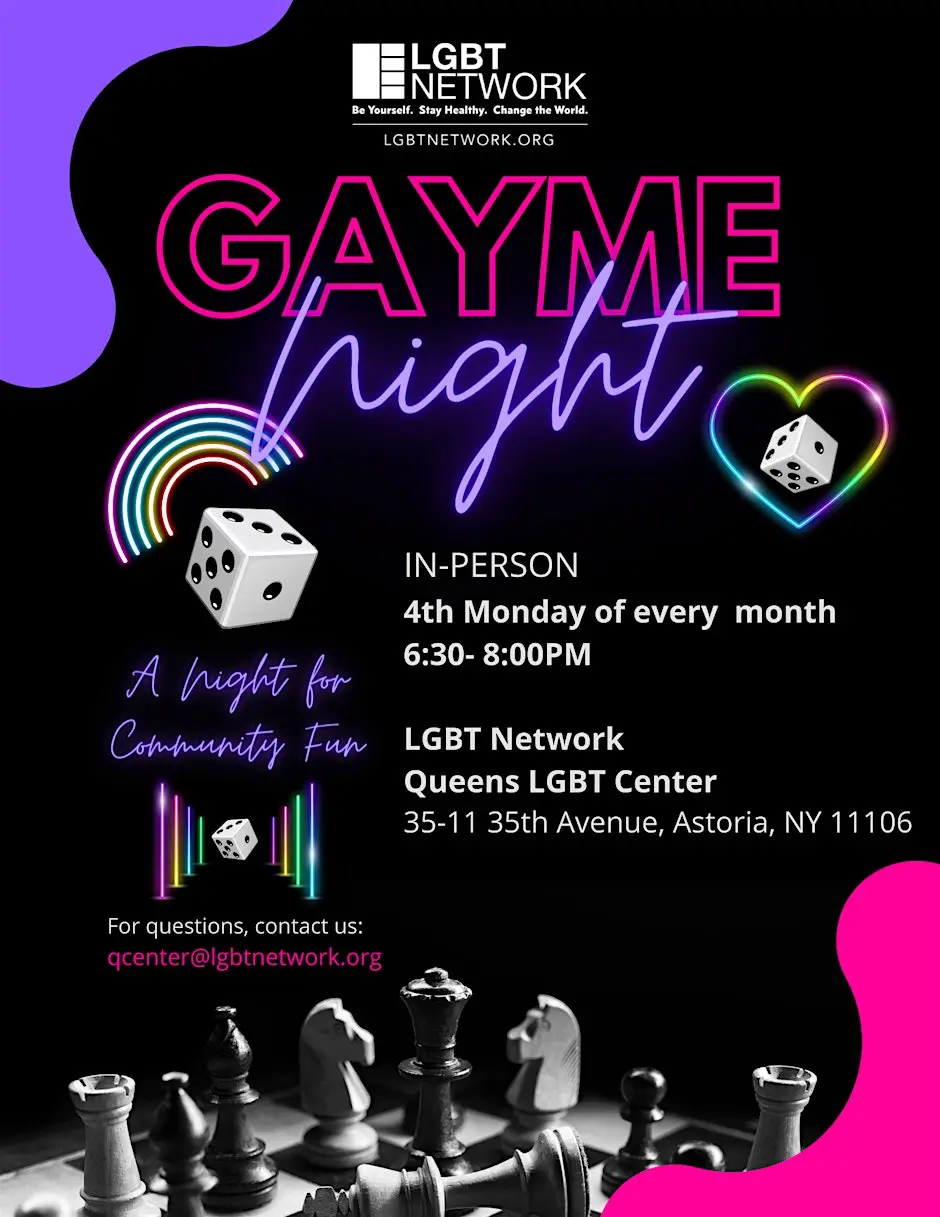 Q-Center 35-11 35th Avenue, Queens, NY, United StatesJoin the fun at the Q-Center in Astoria, Queens! Our awesome, fun-loving staff MC a night of games and good times! We'll play a variety of group party games and guide any new folks through them all. It promises to be a rip-roaring evening of strategy, laughter, and bonding time. Program Target Audience: all 18+