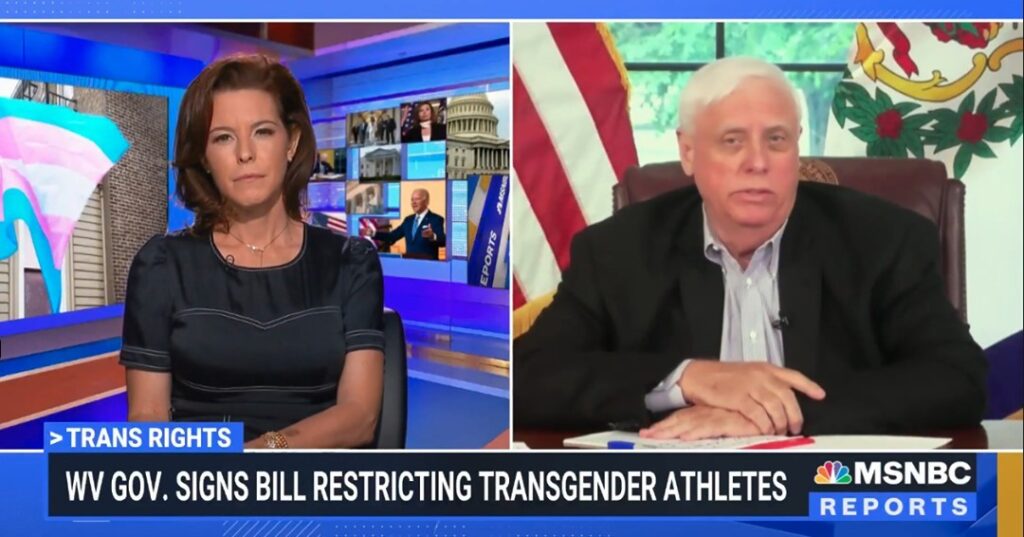 “I don’t have that experience exactly myself right now,” Governor Jim Justice replied when asked by anchor Stephanie Ruhle to cite an example of a trans athlete trying to gain a competitive advantage by joining a girls’ sport team.